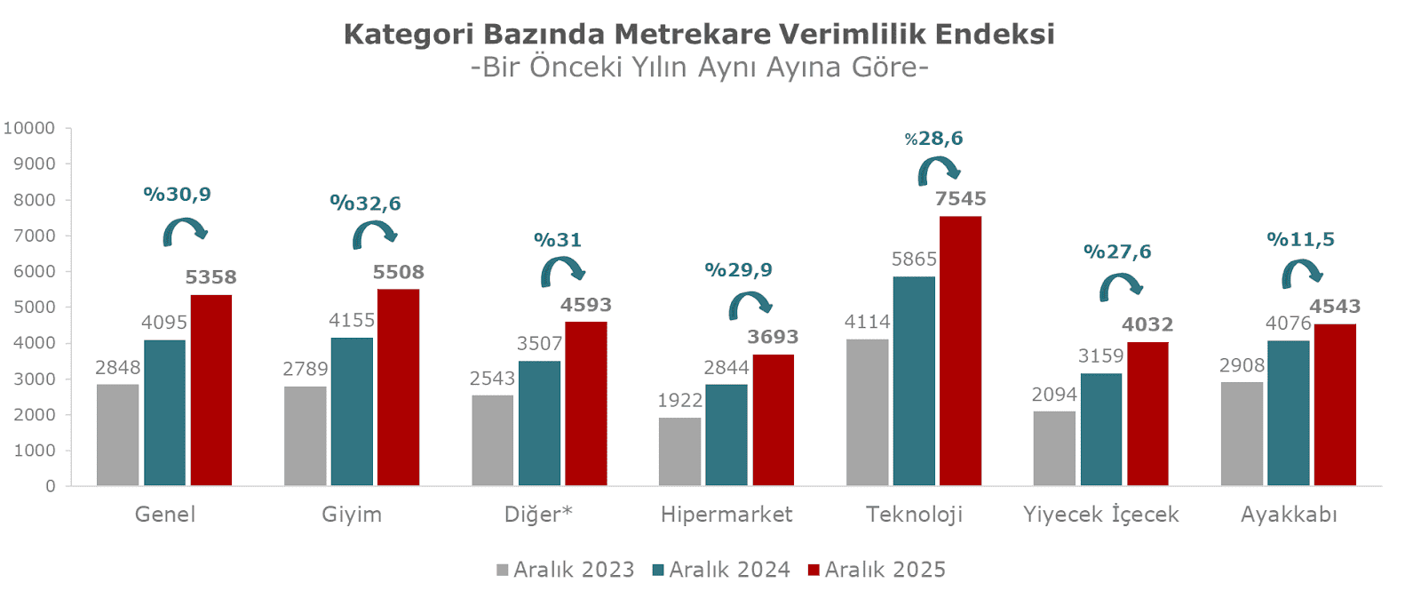 Alışveriş Merkezleri ve Yatırımcıları Derneği (AYD) ile Akademetre Research tarafından ortaklaşa oluşturulan AVM Endeksi’nin Aralık ayı sonuçları açıklandı. Her ay düzenli olarak yayınlanan verilere göre ciro endeksi, Aralık 2025 döneminde, bir önceki yılın aynı ayı ile karşılaştırıldığında ve enflasyondan arındırılmamış olarak incelendiğinde yüzde 30,9 oranında artarak 5358 puana yükseldi. Ancak, Aralık 2025 için açıklanan yıllık enflasyon oranının yüzde 30,89 olduğu dikkate alındığında, metrekare verimlilik endeksindeki artışın enflasyon ile paralel olduğu görülüyor. Bir önceki aya göre değerlendirildiğinde, AVM metrekare verimliliği yüzde 7,1 oranında yükseliş gösterdi. Kategoriler bazında incelendiğinde, hipermarket kategorisinde yüzde 21,4 oranında artış yaşanırken, en düşük artış oranı teknoloji kategorisinde yüzde 2,8 olarak kaydedilmiştir.