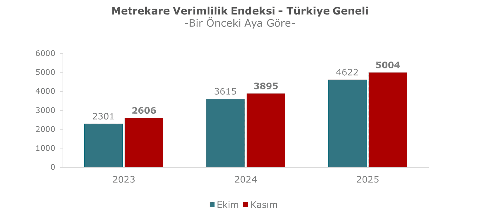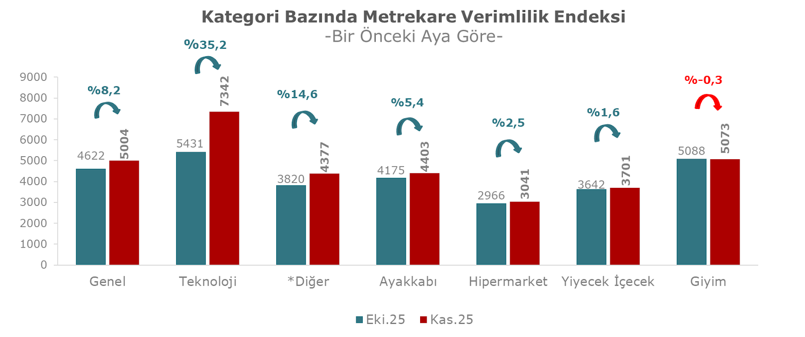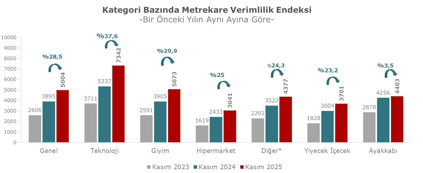 Alışveriş Merkezleri ve Yatırımcıları Derneği (AYD) ile Akademetre Research tarafından ortaklaşa oluşturulan AVM Endeksi’nin Kasım ayı sonuçları açıklandı. Her ay düzenli olarak yayınlanan verilere göre ciro endeksi, Kasım 2025 döneminde, bir önceki yılın aynı ayı ile karşılaştırıldığında ve enflasyondan arındırılmamış olarak incelendiğinde yüzde 28,5 oranında artarak 5004 puana yükseldi. Ancak, Kasım 2025 için açıklanan yıllık enflasyon oranının yüzde 31,07 olduğu dikkate alındığında, metrekare verimlilik endeksindeki artışın enflasyonun altında kaldığı görülüyor. Bu durum, reel anlamda AVM cirolarında sınırlı bir daralmaya işaret ediyor. Bir önceki aya göre değerlendirildiğinde, AVM metrekare verimliliği yüzde 8,2 oranında yükseliş gösterdi. Kategoriler bazında incelendiğinde, teknoloji kategorisinde yüzde 35,2 oranında artış yaşanırken, giyim kategorisinde yüzde -0,3 oranında düşüş kaydedildi.