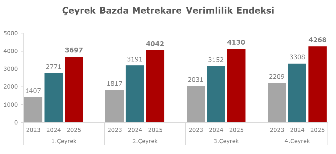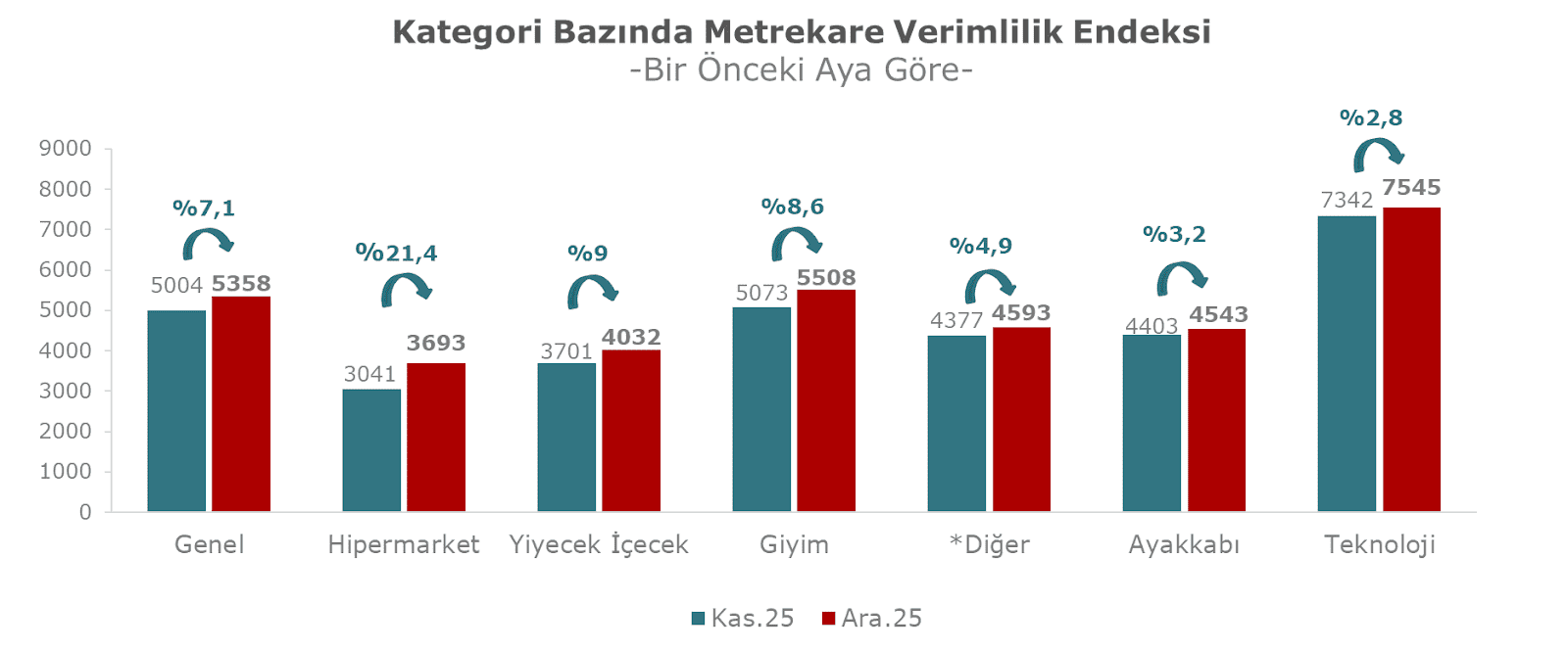 Alışveriş Merkezleri ve Yatırımcıları Derneği (AYD) ile Akademetre Research tarafından ortaklaşa oluşturulan AVM Endeksi’nin Aralık ayı sonuçları açıklandı. Her ay düzenli olarak yayınlanan verilere göre ciro endeksi, Aralık 2025 döneminde, bir önceki yılın aynı ayı ile karşılaştırıldığında ve enflasyondan arındırılmamış olarak incelendiğinde yüzde 30,9 oranında artarak 5358 puana yükseldi. Ancak, Aralık 2025 için açıklanan yıllık enflasyon oranının yüzde 30,89 olduğu dikkate alındığında, metrekare verimlilik endeksindeki artışın enflasyon ile paralel olduğu görülüyor. Bir önceki aya göre değerlendirildiğinde, AVM metrekare verimliliği yüzde 7,1 oranında yükseliş gösterdi. Kategoriler bazında incelendiğinde, hipermarket kategorisinde yüzde 21,4 oranında artış yaşanırken, en düşük artış oranı teknoloji kategorisinde yüzde 2,8 olarak kaydedilmiştir.
