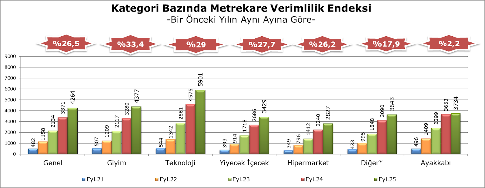 Alışveriş Merkezleri ve Yatırımcıları Derneği (AYD) ile Akademetre Research tarafından ortaklaşa oluşturulan AVM Endeksi’nin Eylül ayı sonuçları açıklandı. Her ay düzenli olarak yayınlanan verilere göre ciro endeksi, Eylül 2025 döneminde, bir önceki yılın aynı ayı ile karşılaştırıldığında ve enflasyondan arındırılmamış olarak incelendiğinde yüzde 26,5 oranında artarak 4264 puana yükseldi. Ancak, Eylül 2025 için açıklanan yıllık enflasyon oranının %33,29 olduğu dikkate alındığında, metrekare verimlilik endeksindeki artışın enflasyonun altında kaldığı görülüyor. Bu durum, reel anlamda AVM cirolarında sınırlı bir daralmaya işaret ediyor. Bir önceki aya göre değerlendirildiğinde, AVM metrekare verimliliği %2,8 oranında daralma gösterdi. Kategoriler bazında incelendiğinde, teknoloji kategorisinde %10,8 oranında artış yaşanırken, yiyecek-içecek kategorisinde %7,7 oranında düşüş kaydedildi. Bu veriler, tüketicinin özellikle gıda dışı harcamalarda teknolojiye öncelik verdiğini, ancak artan yaşam maliyetleri nedeniyle yeme-içme harcamalarını kısmaya yöneldiğini gösteriyor.