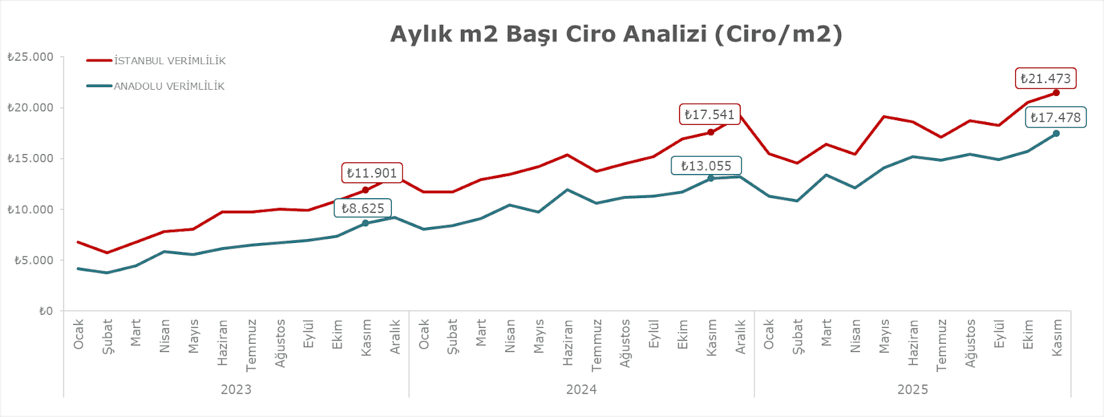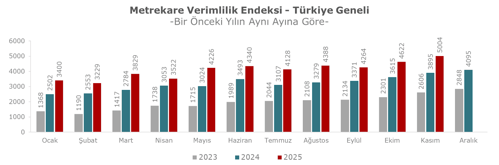 Alışveriş Merkezleri ve Yatırımcıları Derneği (AYD) ile Akademetre Research tarafından ortaklaşa oluşturulan AVM Endeksi’nin Kasım ayı sonuçları açıklandı. Her ay düzenli olarak yayınlanan verilere göre ciro endeksi, Kasım 2025 döneminde, bir önceki yılın aynı ayı ile karşılaştırıldığında ve enflasyondan arındırılmamış olarak incelendiğinde yüzde 28,5 oranında artarak 5004 puana yükseldi. Ancak, Kasım 2025 için açıklanan yıllık enflasyon oranının yüzde 31,07 olduğu dikkate alındığında, metrekare verimlilik endeksindeki artışın enflasyonun altında kaldığı görülüyor. Bu durum, reel anlamda AVM cirolarında sınırlı bir daralmaya işaret ediyor. Bir önceki aya göre değerlendirildiğinde, AVM metrekare verimliliği yüzde 8,2 oranında yükseliş gösterdi. Kategoriler bazında incelendiğinde, teknoloji kategorisinde yüzde 35,2 oranında artış yaşanırken, giyim kategorisinde yüzde -0,3 oranında düşüş kaydedildi.